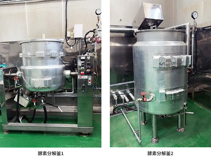 当社独自の酵素分解釜は振動エネルギーを加えることで酵素の活性を高め、加熱時間を短縮。残渣を減らし、効率的に栄養分を抽出します。