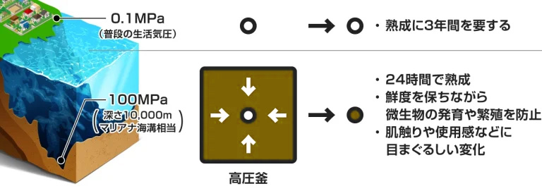 100MPaの高圧を24時間加えることで、自然熟成と同等の品質を短時間で実現します。