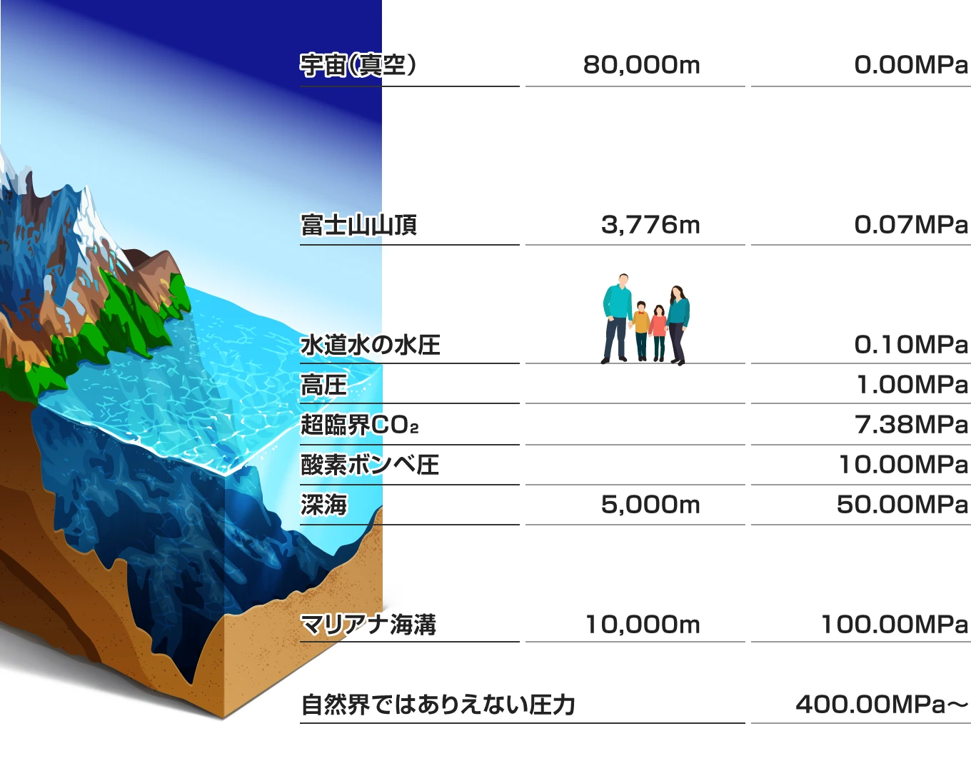 日常環境は約1気圧(0.1MPa)ですが、高圧とはこの1気圧以上の圧力を指します。